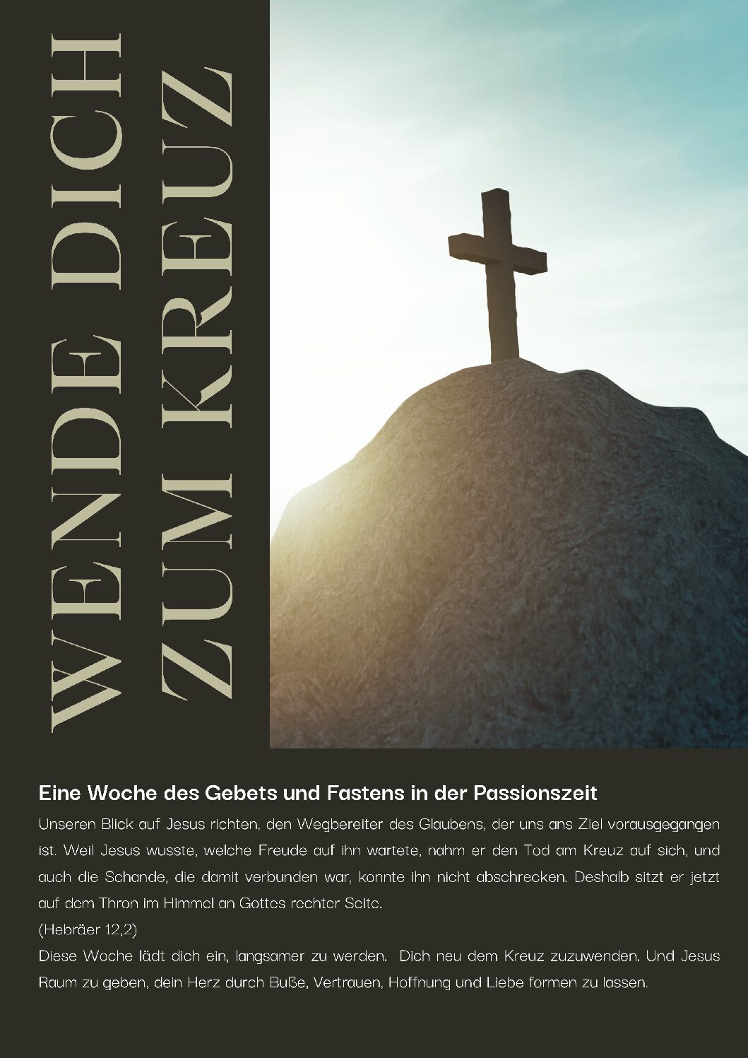 Die Passionszeit lädt uns ein, innezuhalten und unseren Blick neu auf Jesus zu richten. In einer Zeit voller Tempo, Ablenkung und Anforderungen wollen wir bewusst langsamer werden und uns dem Kreuz zuwenden – dem Ort, an dem Gottes Liebe, Gnade und Hoffnung sichtbar wurden.
